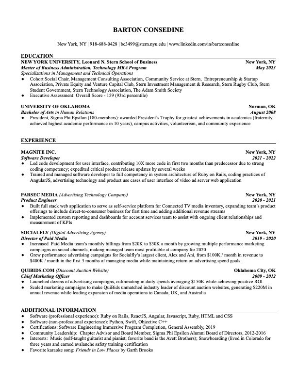 I began my career in digital advertising and worked at a variety of start-ups, advertising agencies, and had a few entrepreneurial pursuits. I served as a co-founder and Chief Marketing Officer of QuiBids.com, an auction website that I was able to help grow to $220M in revenue / year while personally executing an average of $150K / day in paid media. After exiting QuiBids, I stayed in the digital advertising space while cultivating my skills in Software Engineering. In August of 2019, I completed a Software Engineering Immersive program at General Assembly in New York City and began working as a Software Engineer for Advertising Technology companies. Pivoting to Software Engineering was the riskiest, but most rewarding decision I have ever made in my career, and has allowed me to cultivate my growth mindset by facing new challenges on a daily basis.